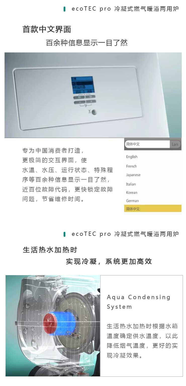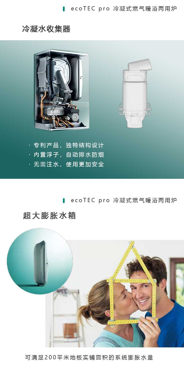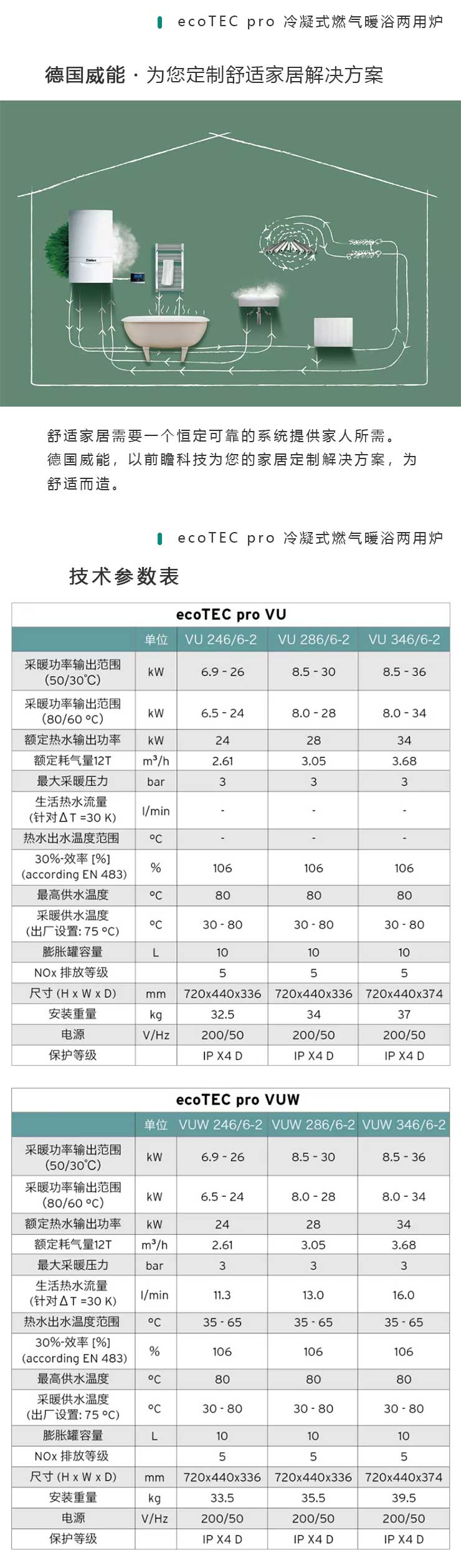 ● 24/28/34kW冷凝熱輸出 ● 采暖和生活熱水需求并重的先進解決方案 ● 藍色背光大顯示器 ● 不銹鋼主熱交換器,耐腐蝕性強 ">