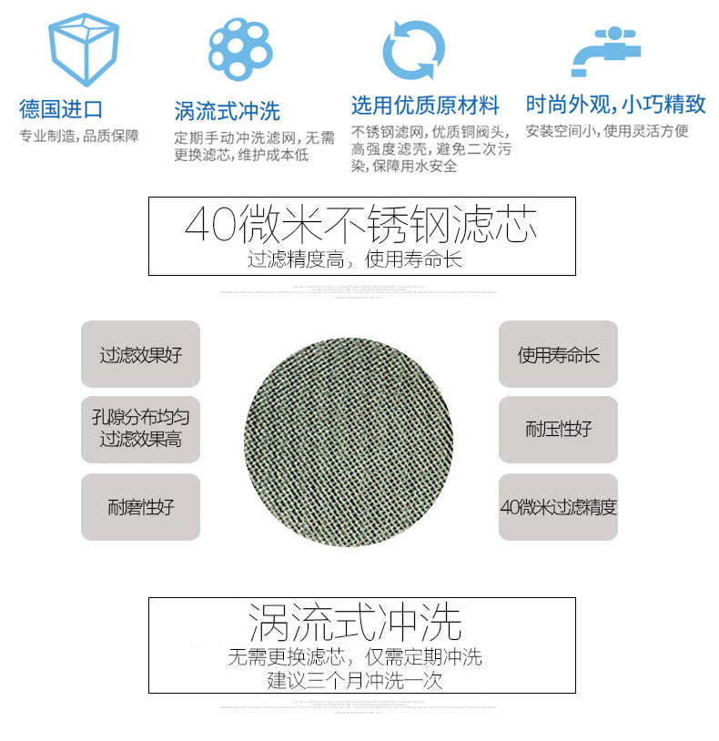 ●40微米過濾,能有效過濾雜質、泥沙、鐵銹、蟲卵