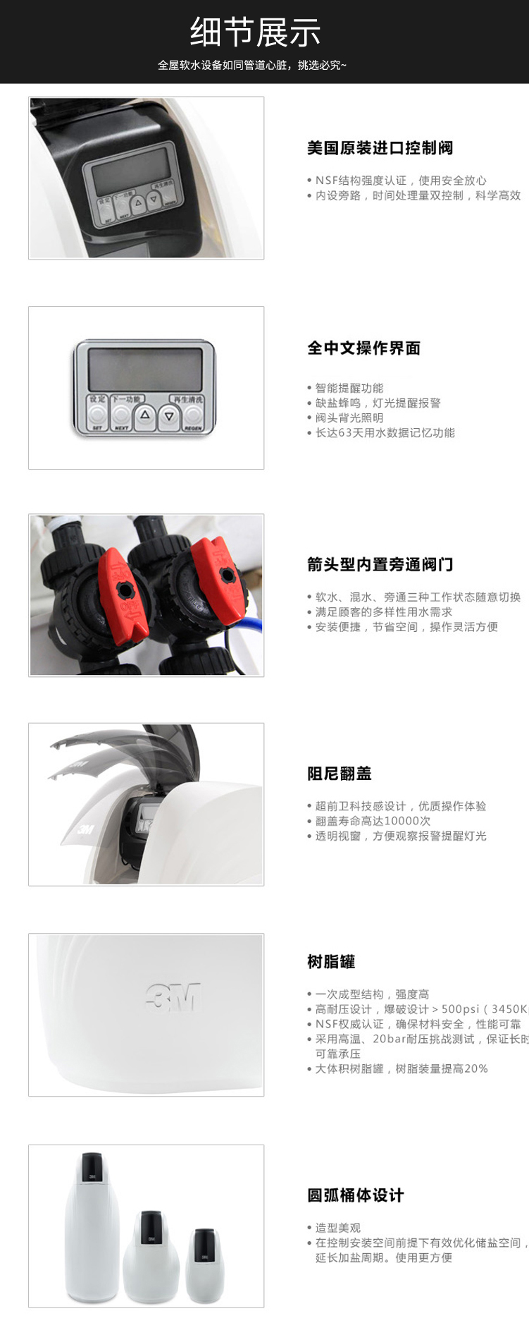 ● 美國原裝控制閥門,智能提醒功能,長時間運(yùn)行可靠,免維護(hù),全中文操作界面更方便,缺鹽蜂鳴,燈光提醒報警